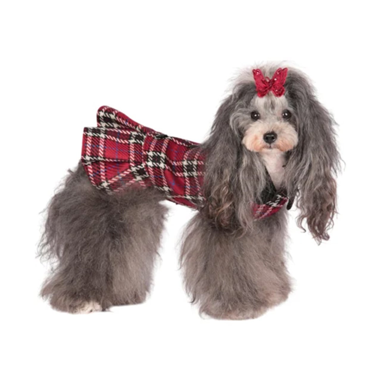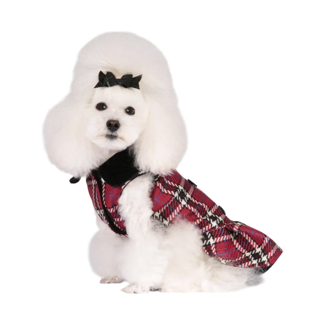 ウール100%、チェック柄でベルベットのピーターパンカラーと背中の大きなボタンがアクセントになっています。