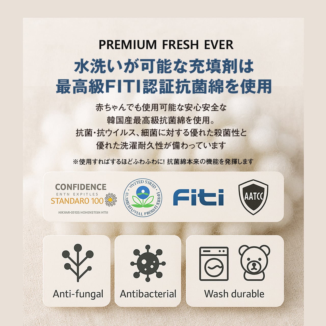 中綿:韓国国内産 FITI認証 抗菌ボール綿