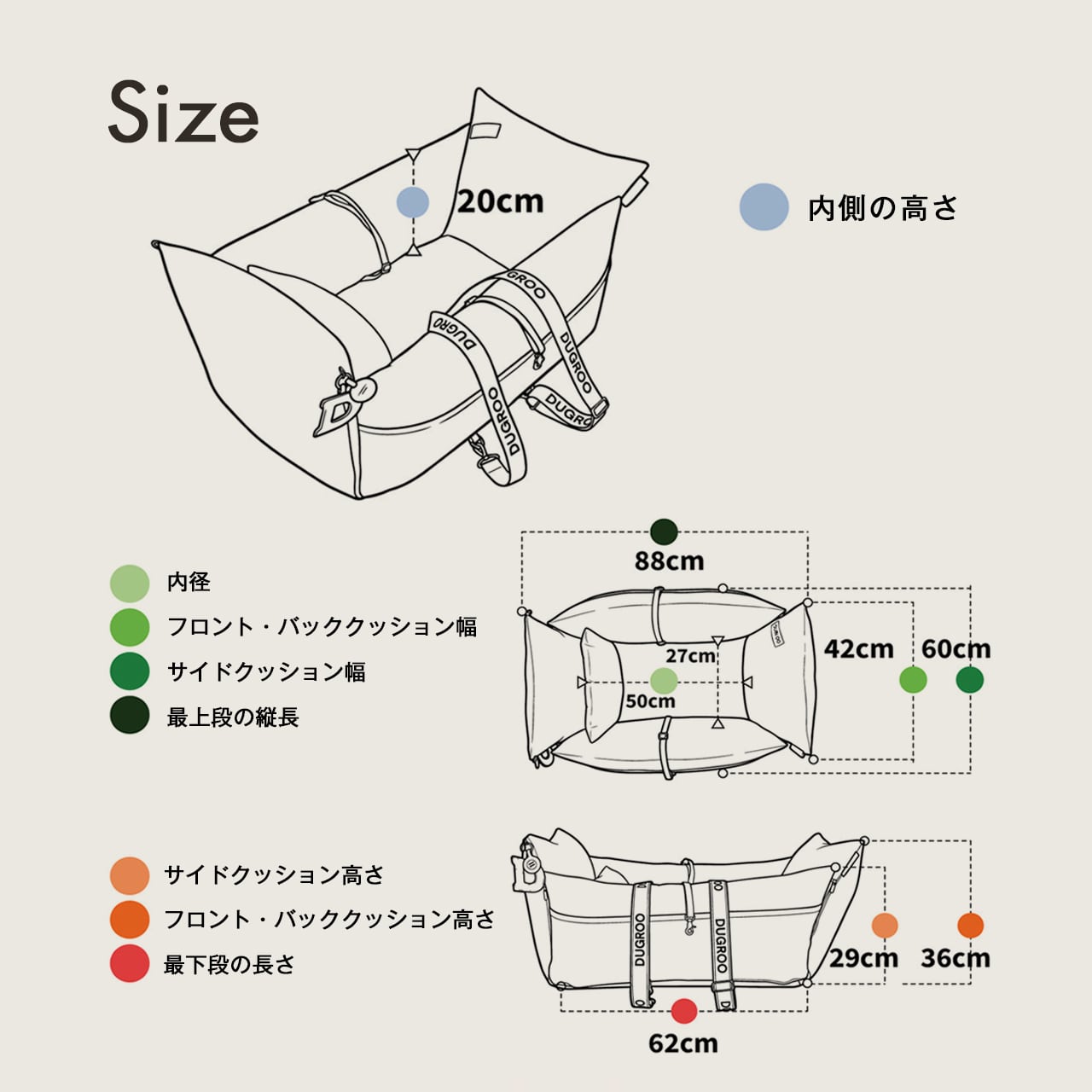 ※クッション厚み込みの外寸です。測り方により±3〜5cm差が出る場合あり。