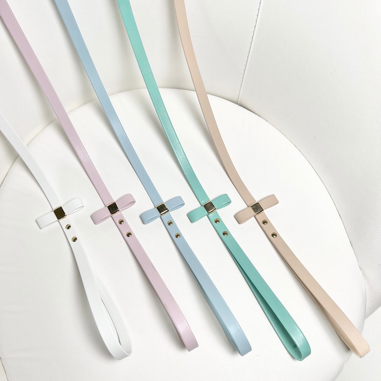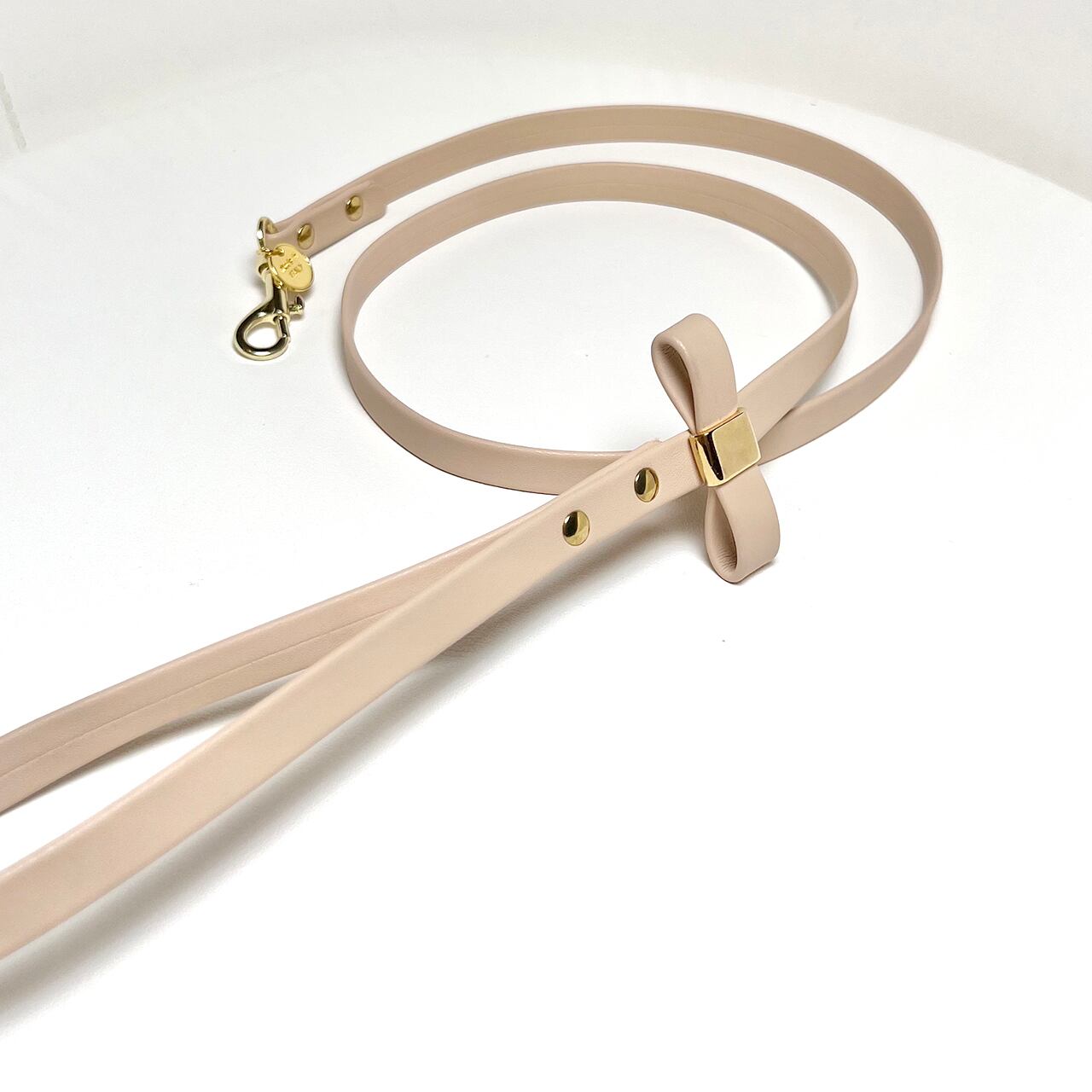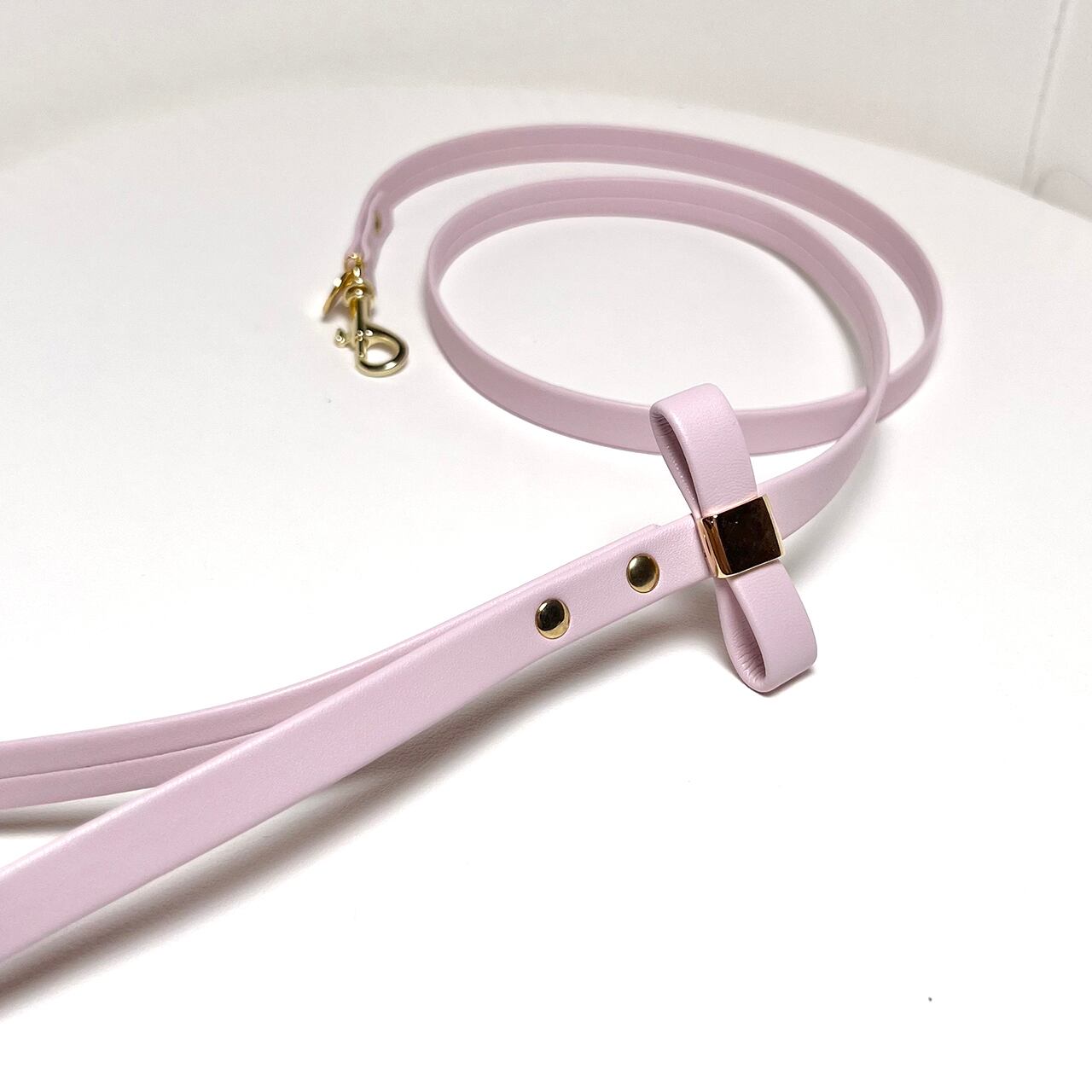 リードの手元には首輪と同じリボンが装飾され、シンプルでエレガントなデザインのリード。