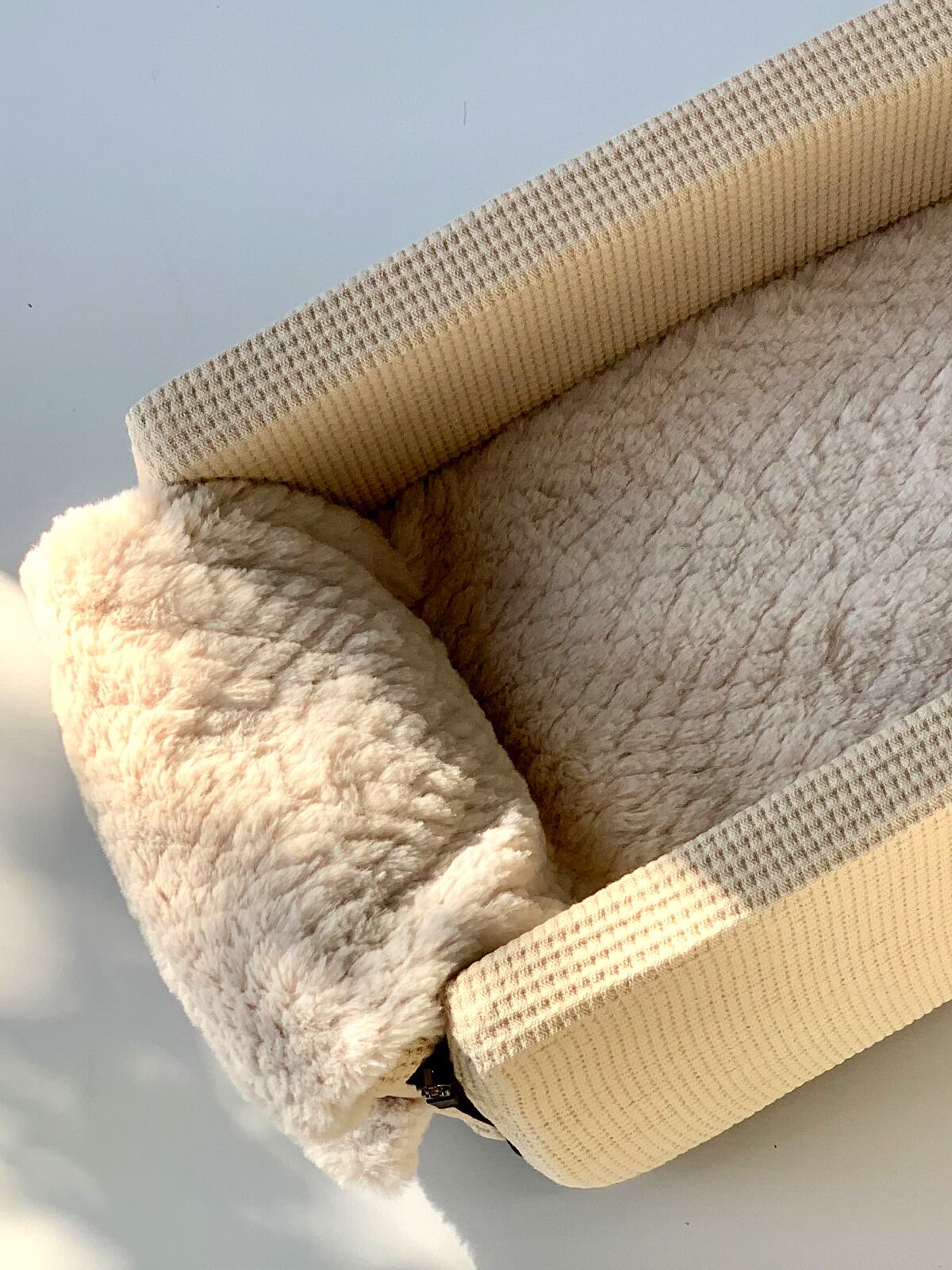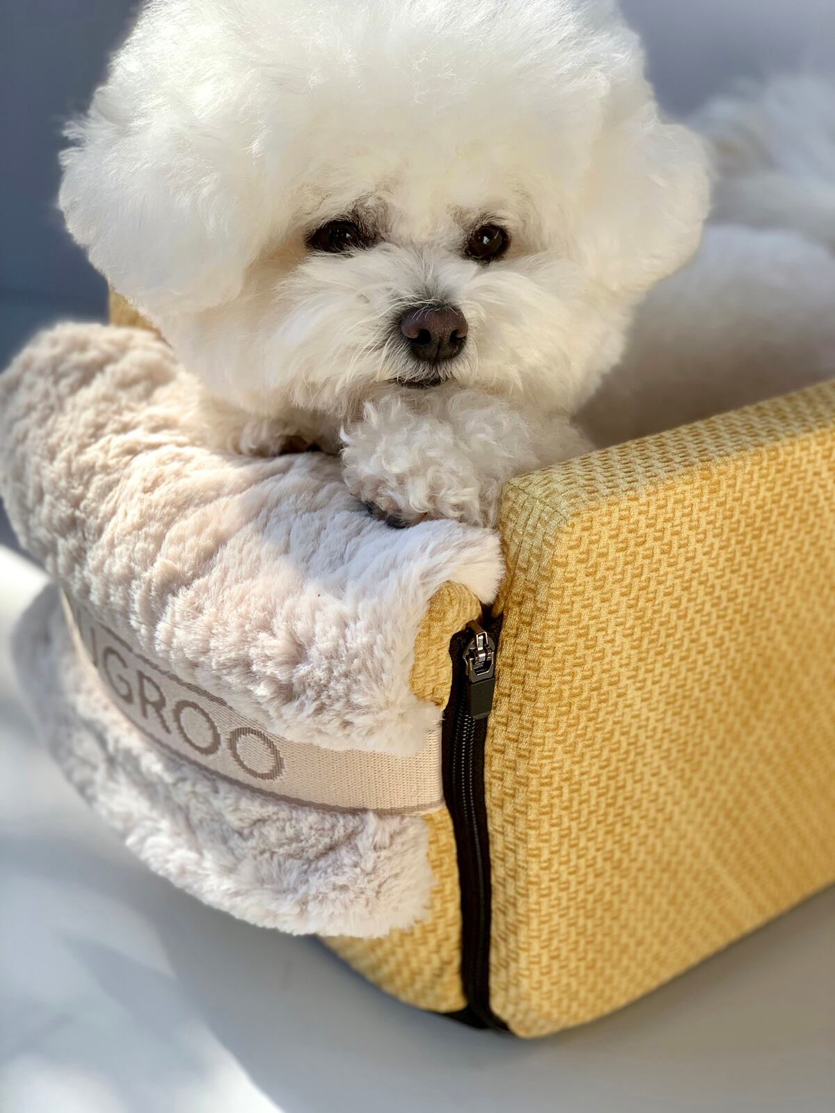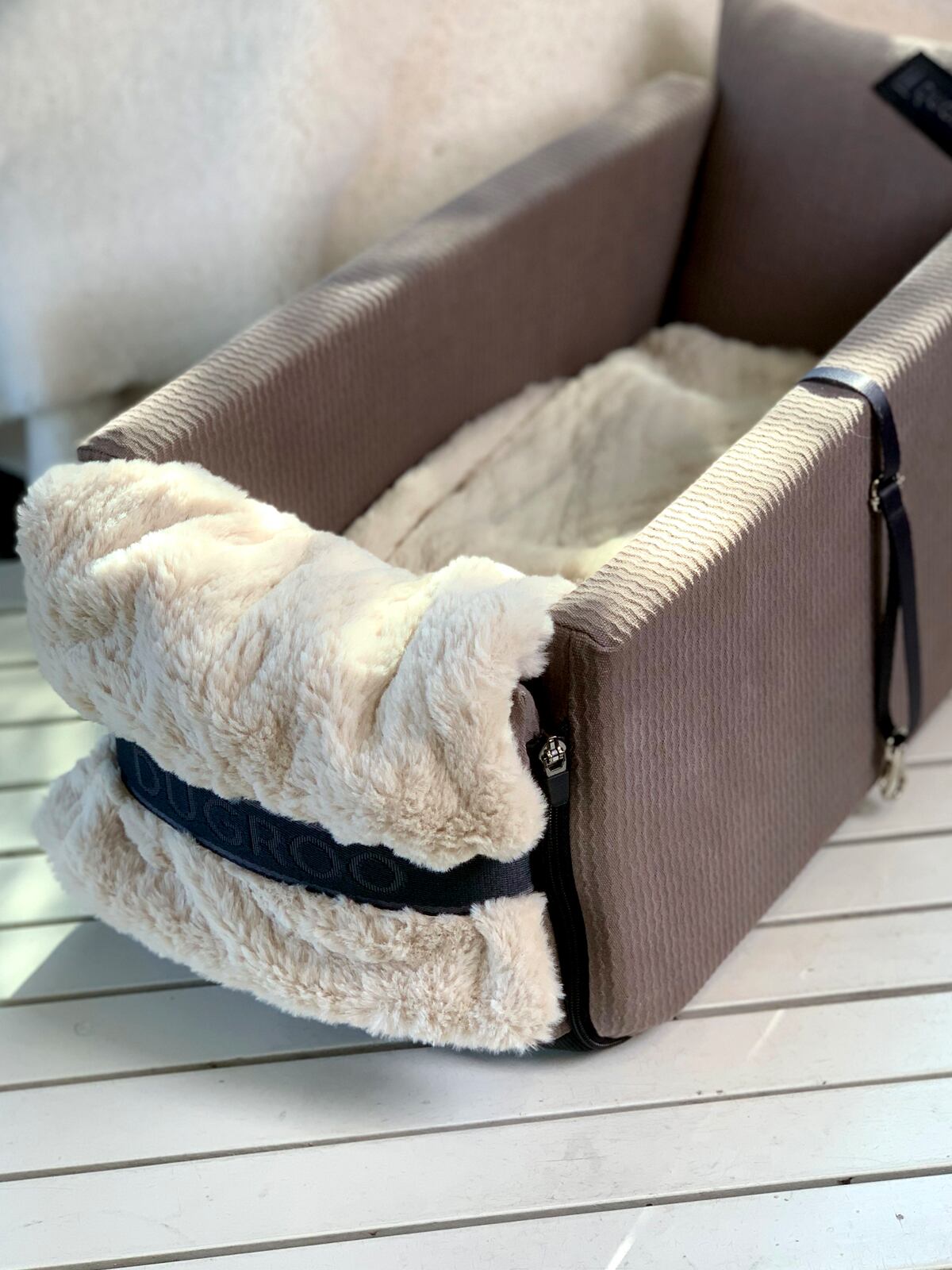 ふんわりとした起毛素材が、移動中の愛犬の体をやさしく包み込み、