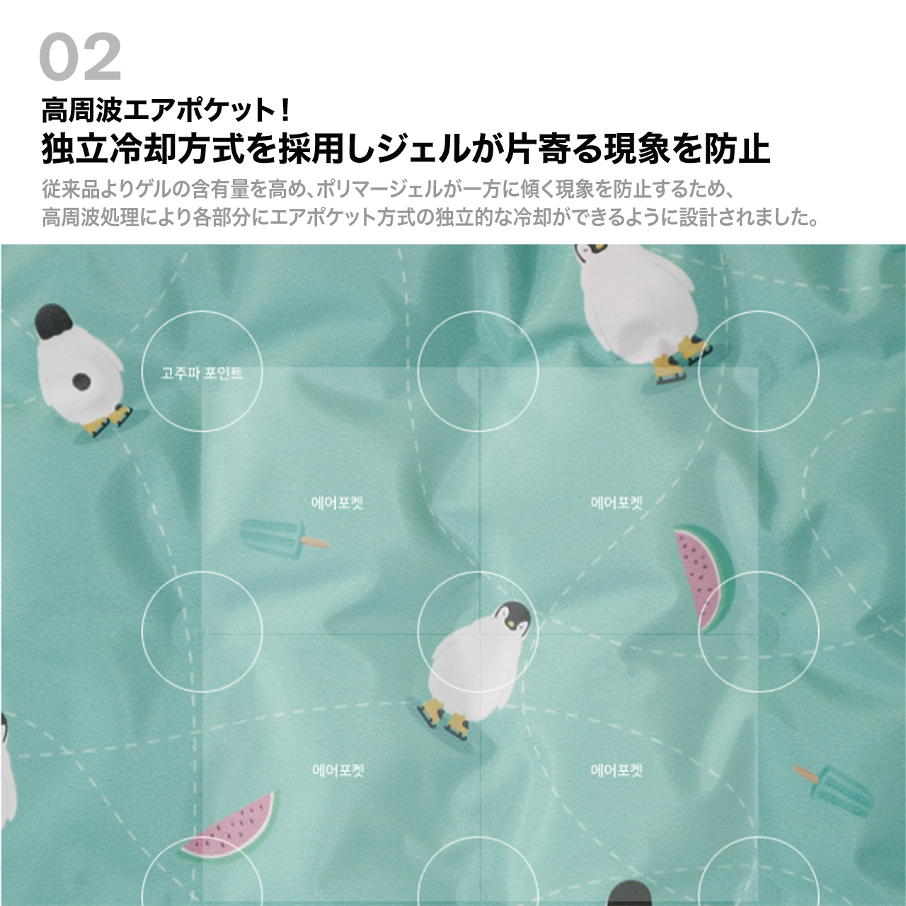 高周波エアポケットで独立冷却方式を採用し、冷却ジェルの傾きがなく、冷却材の流出を遮断しし安心して使用できるクールマットです。