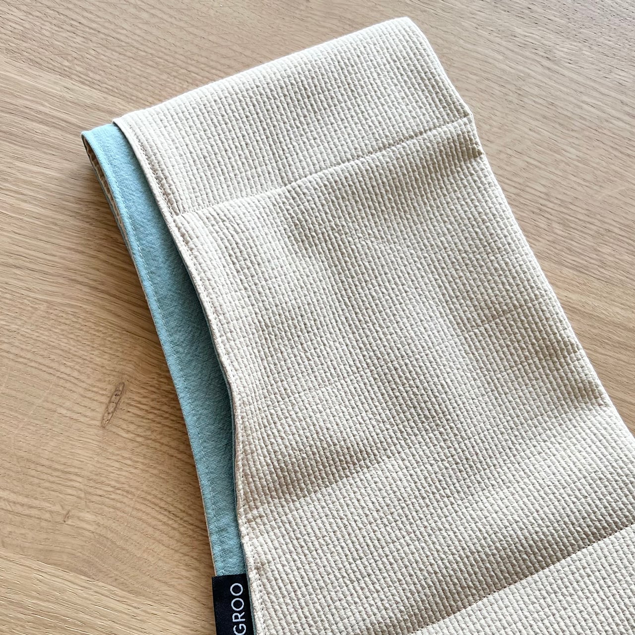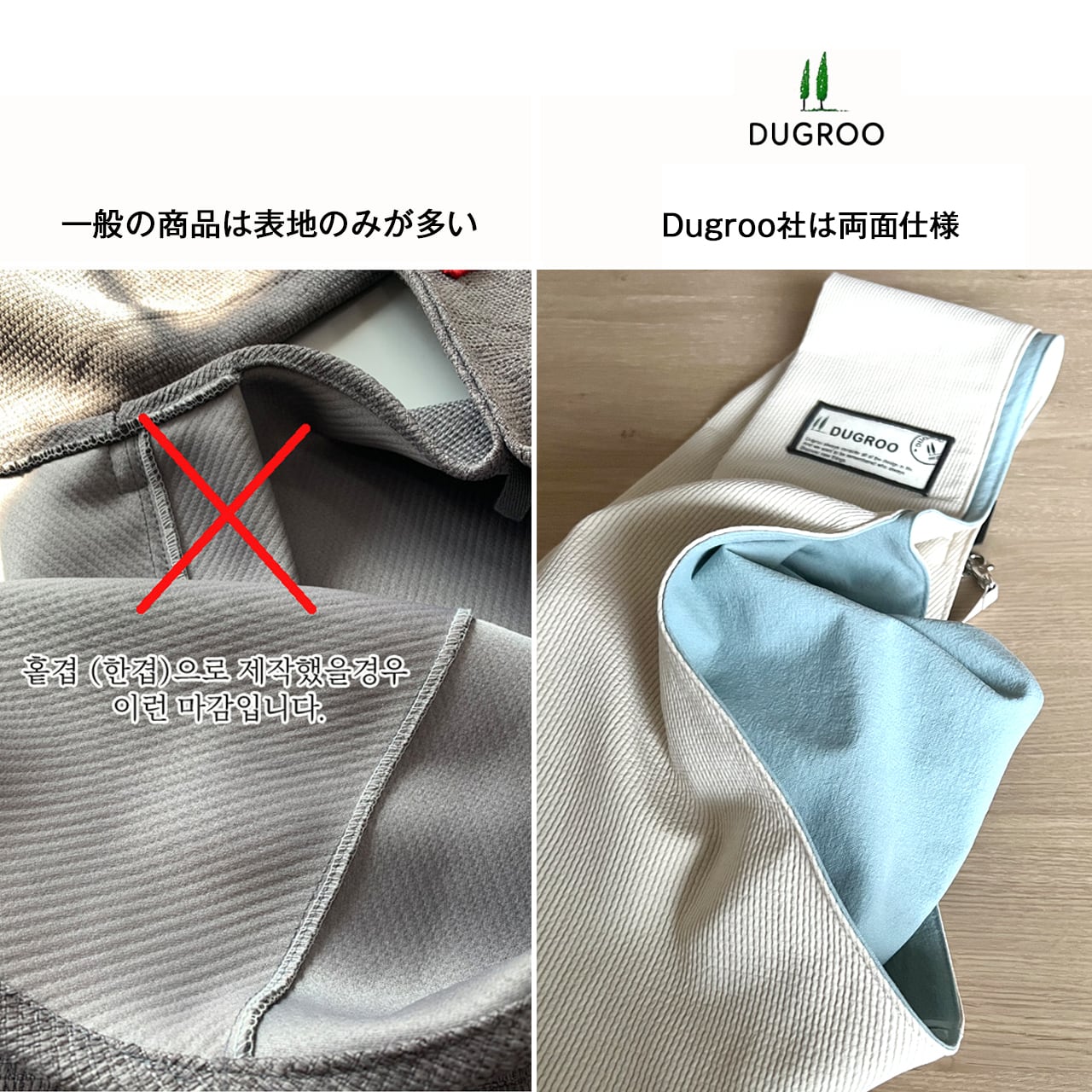 一般的に多い1枚の製品ではなく、生地が二重になっているため、より丈夫で安定感と着心地のよい作りとなっています。