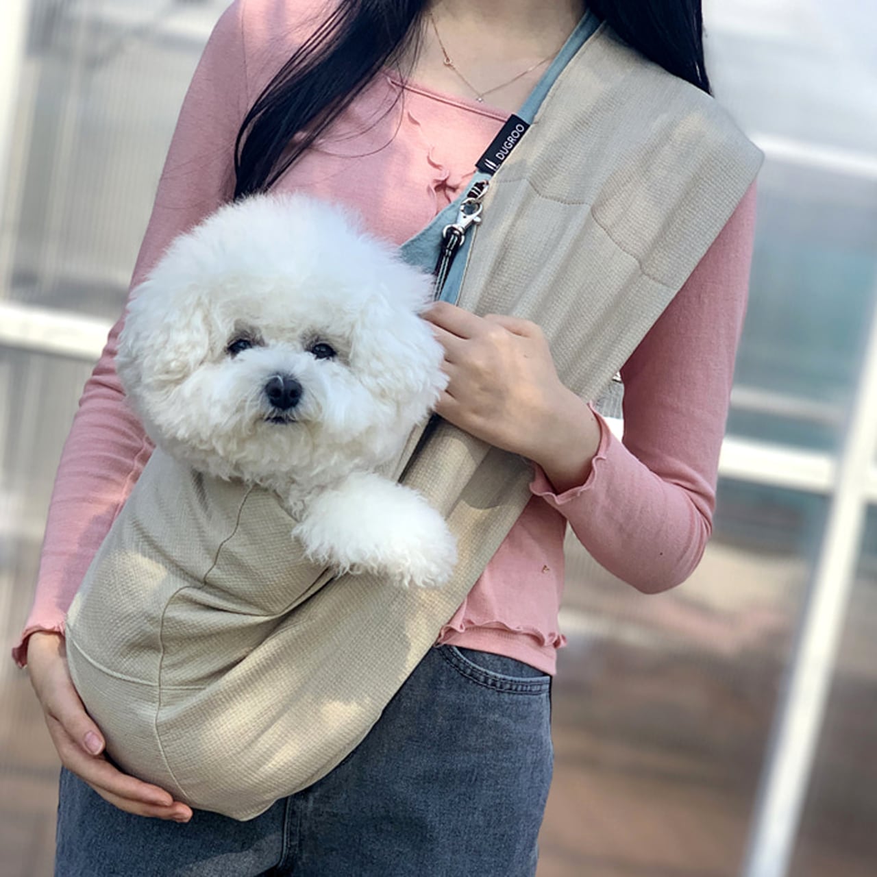 Dugrooスリングバッグはオーナー様と愛犬が一緒に着る服という概念で製作されたスリングバッグです。