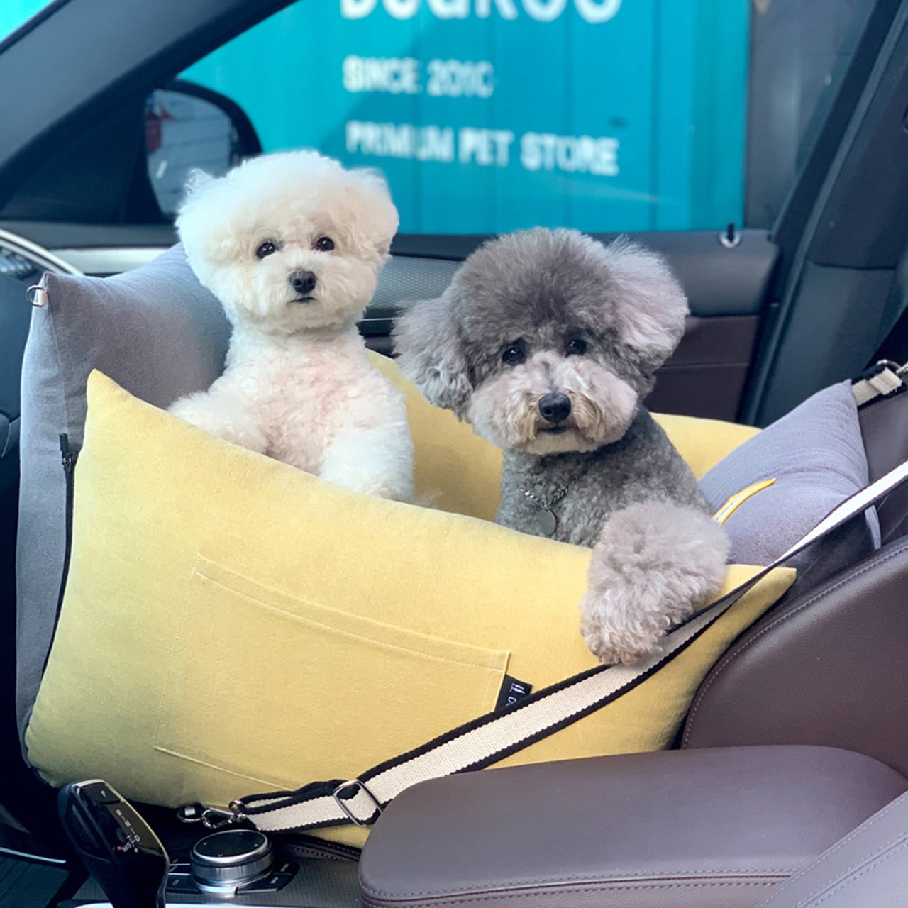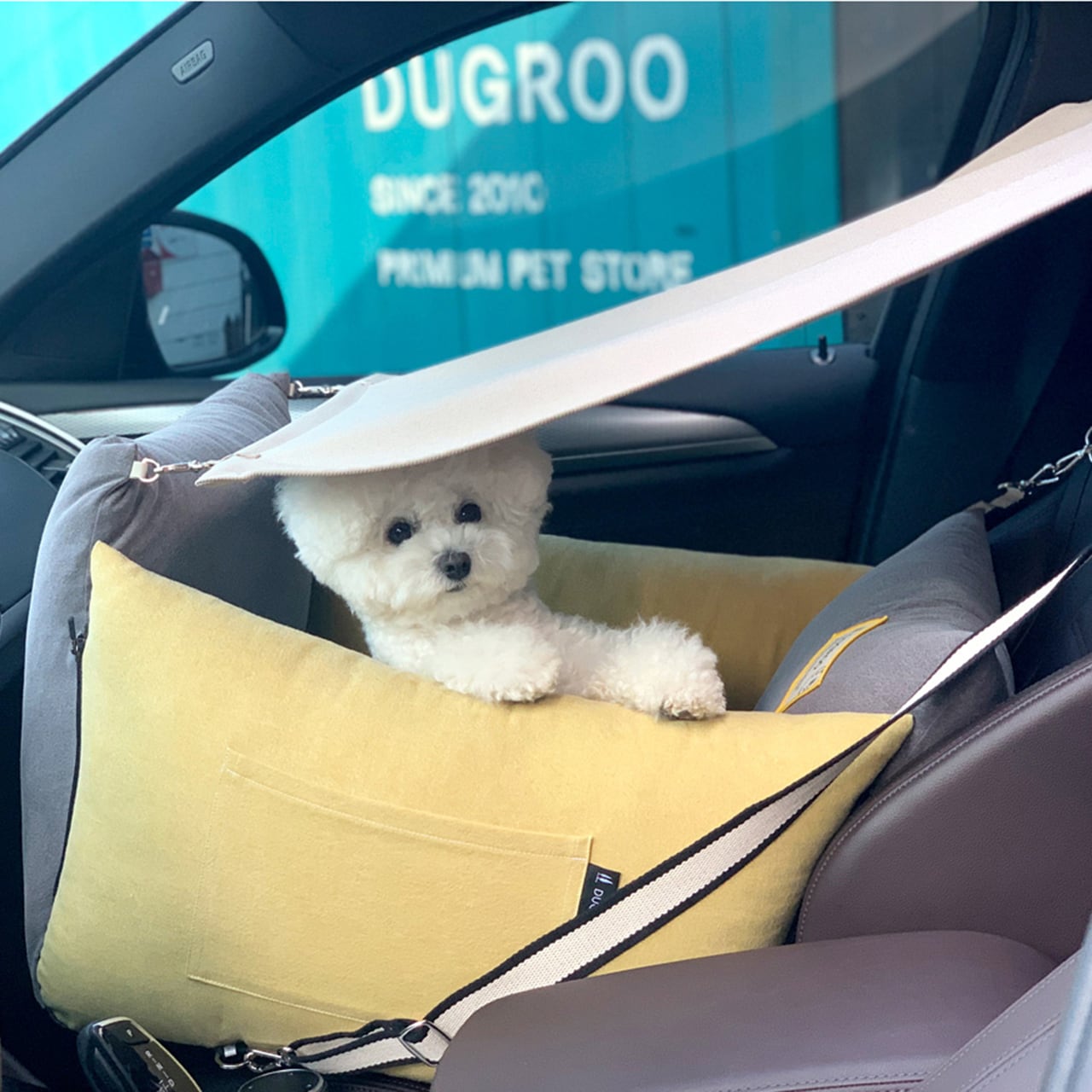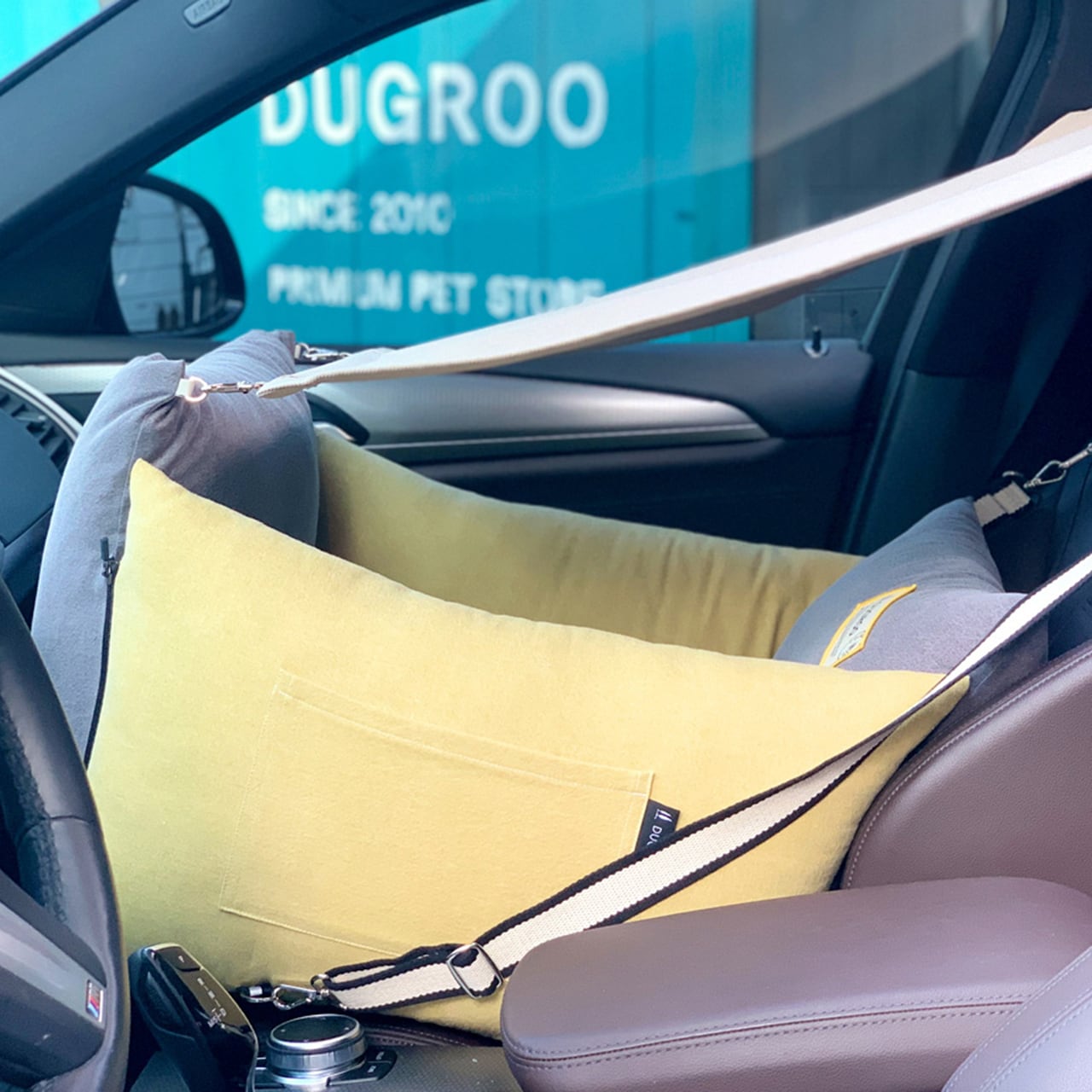 DUGROOペット用オールラウンドドライブベッドは愛犬の車酔いを少なくするために、振動を最小限に抑えるためのシート角度や重量などを考慮の上、デザイン設計されたベッドです。しっかりとした厚みや重量で助手席や後部座席にフィットします。
