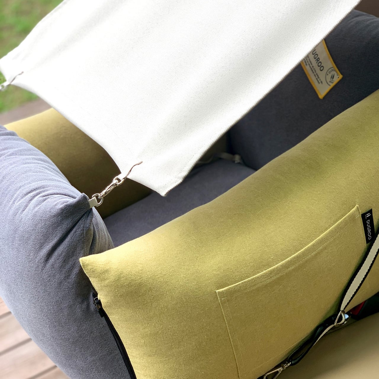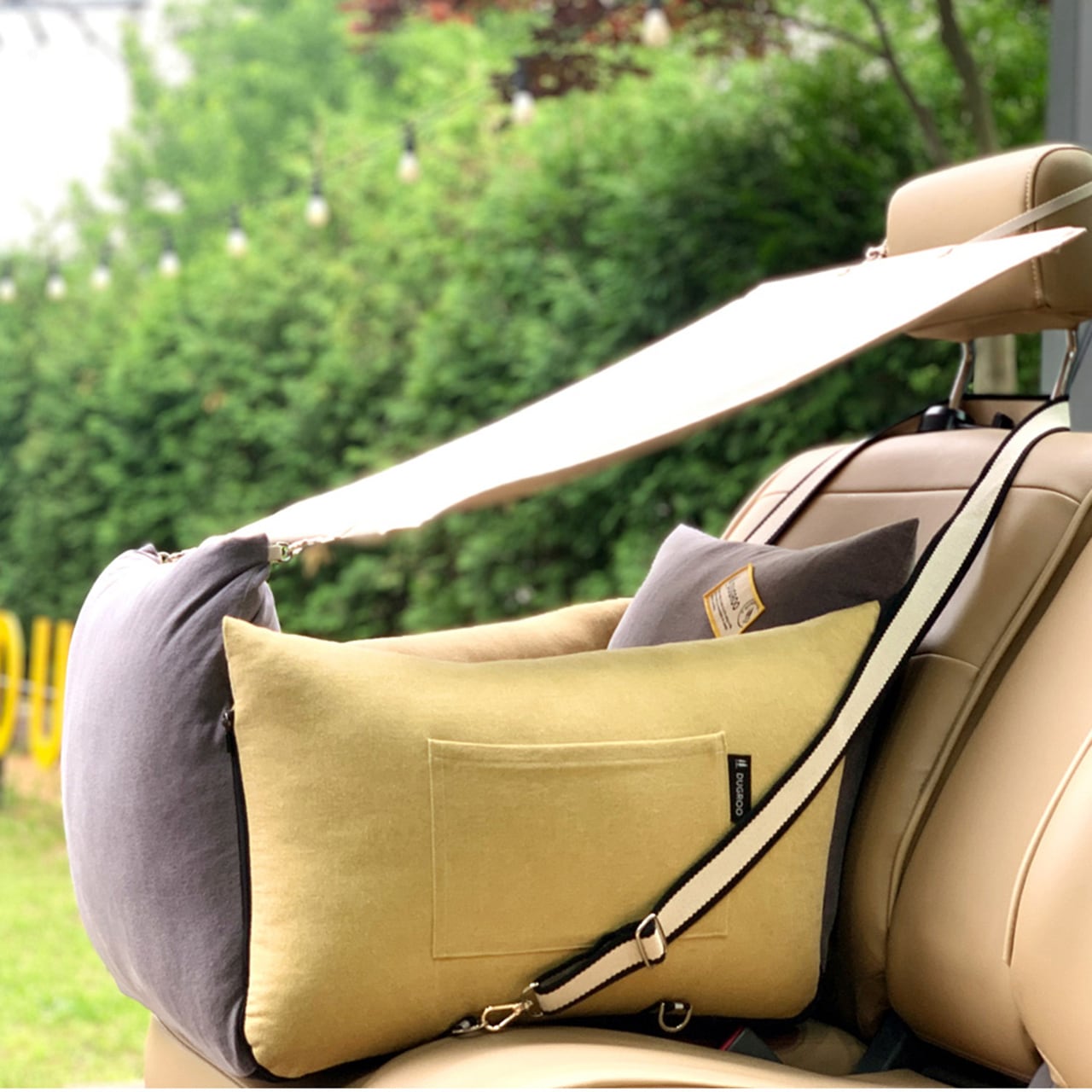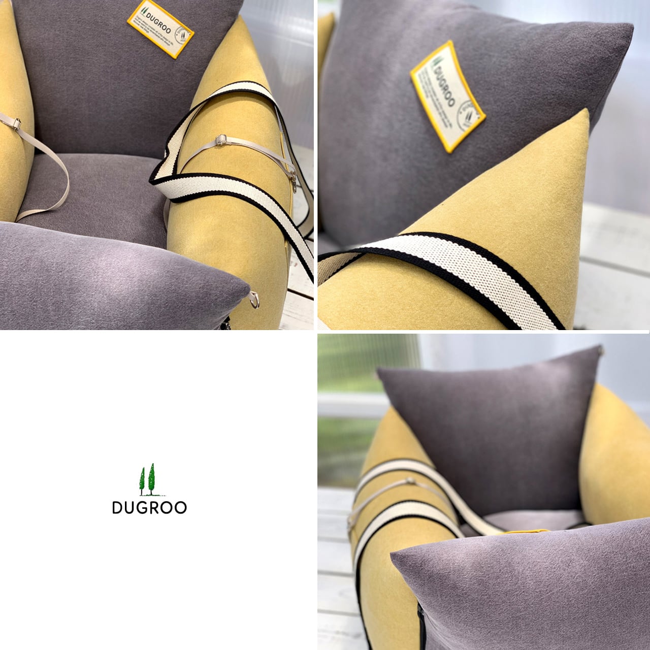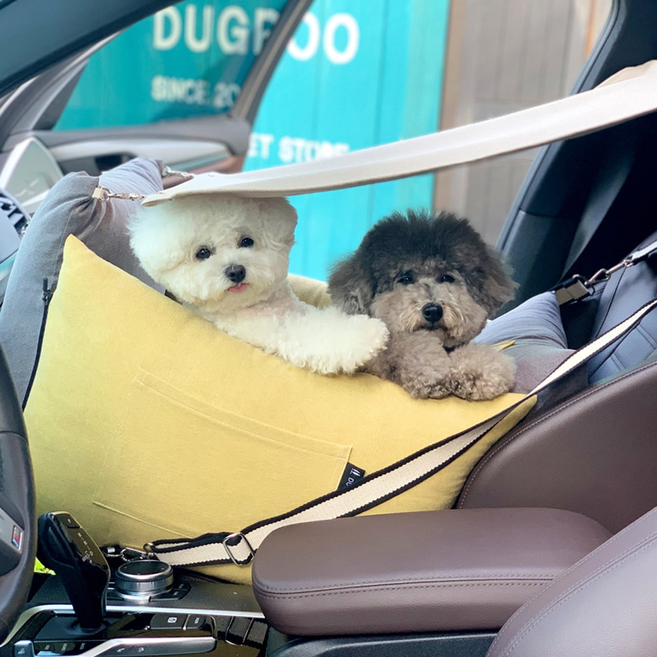 DUGROOペット用オールラウンドドライブベッドは愛犬の車酔いを少なくするために、振動を最小限に抑えるためのシート角度や重量などを考慮の上、デザイン設計されたベッドです。しっかりとした厚みや重量で助手席や後部座席にフィットします。