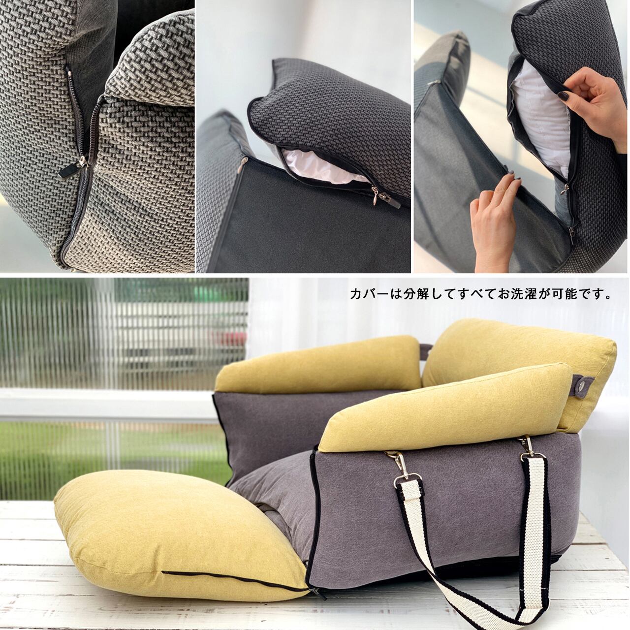 ● 背面両側にあるジッパーを下ろせば家でも使えるクッションベットとしても使用可能な2WAY仕様