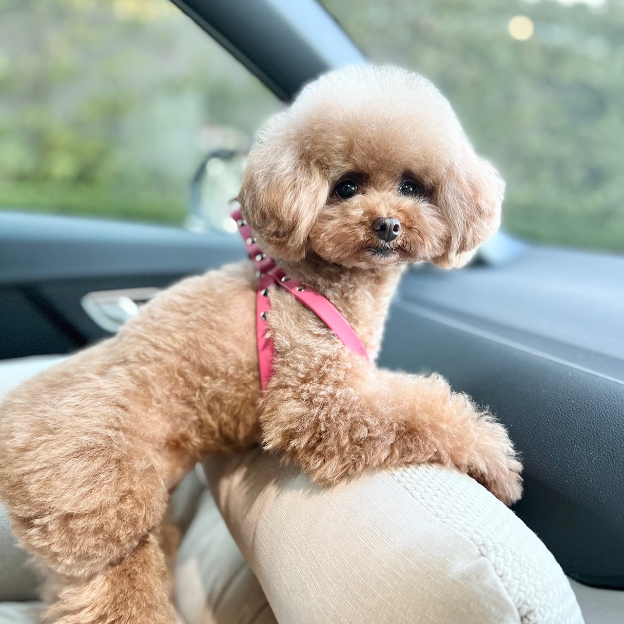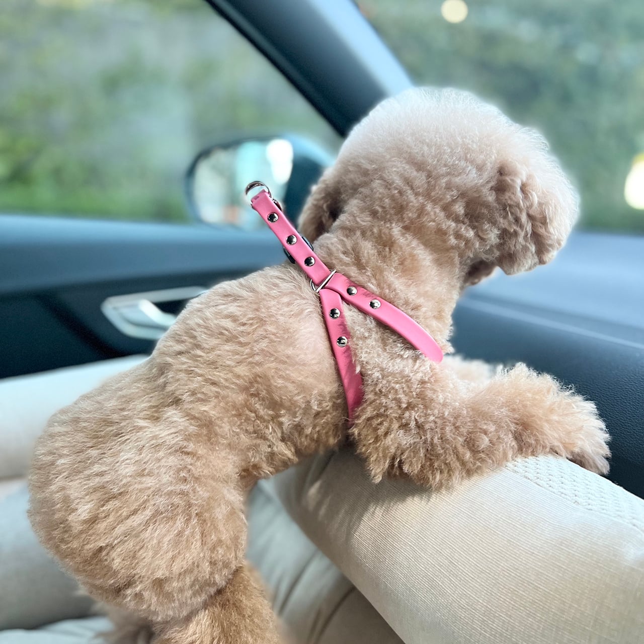 モデル犬は2.2kgのトイプードルで首回り20cm、胴回り33cmでXSサイズを着用しています。
