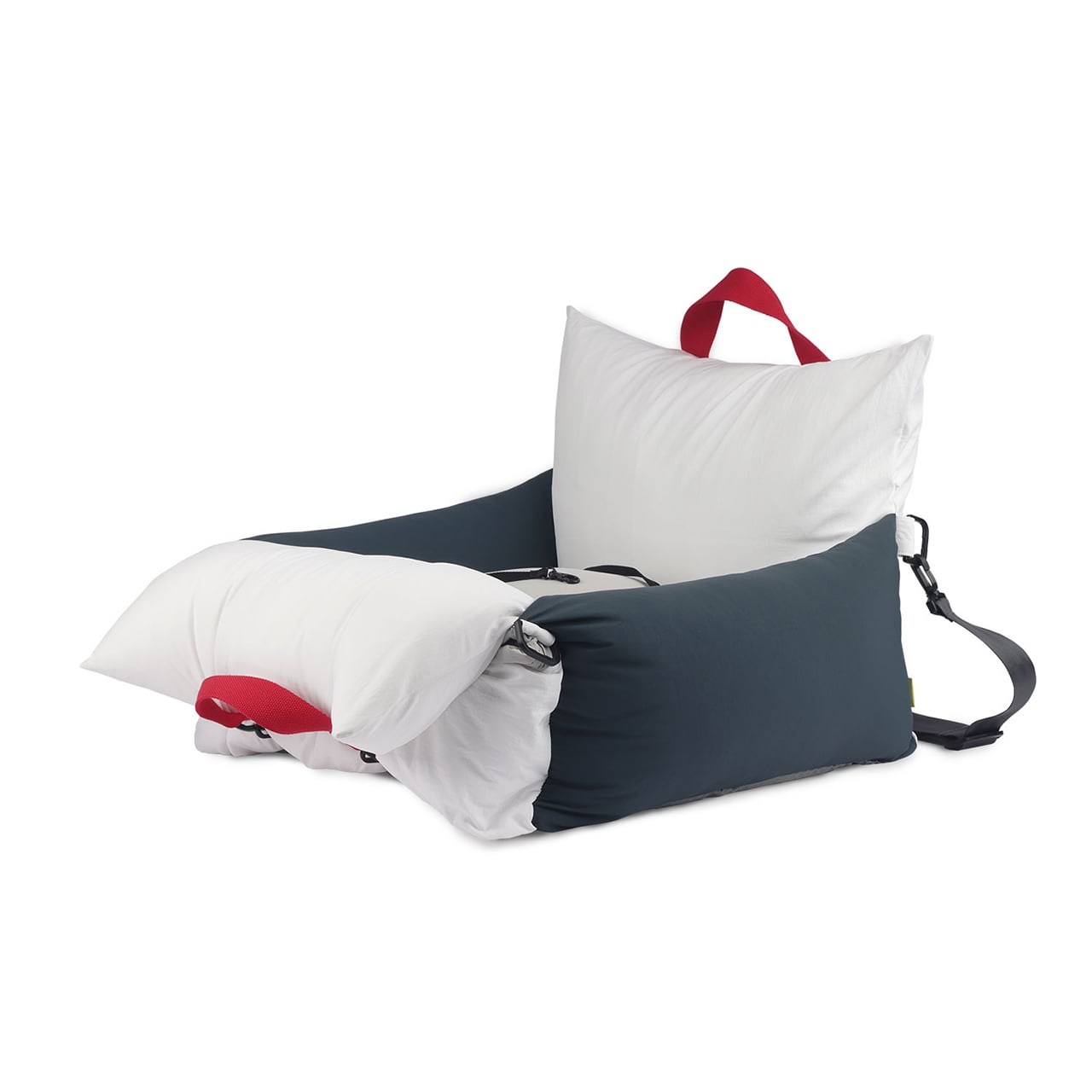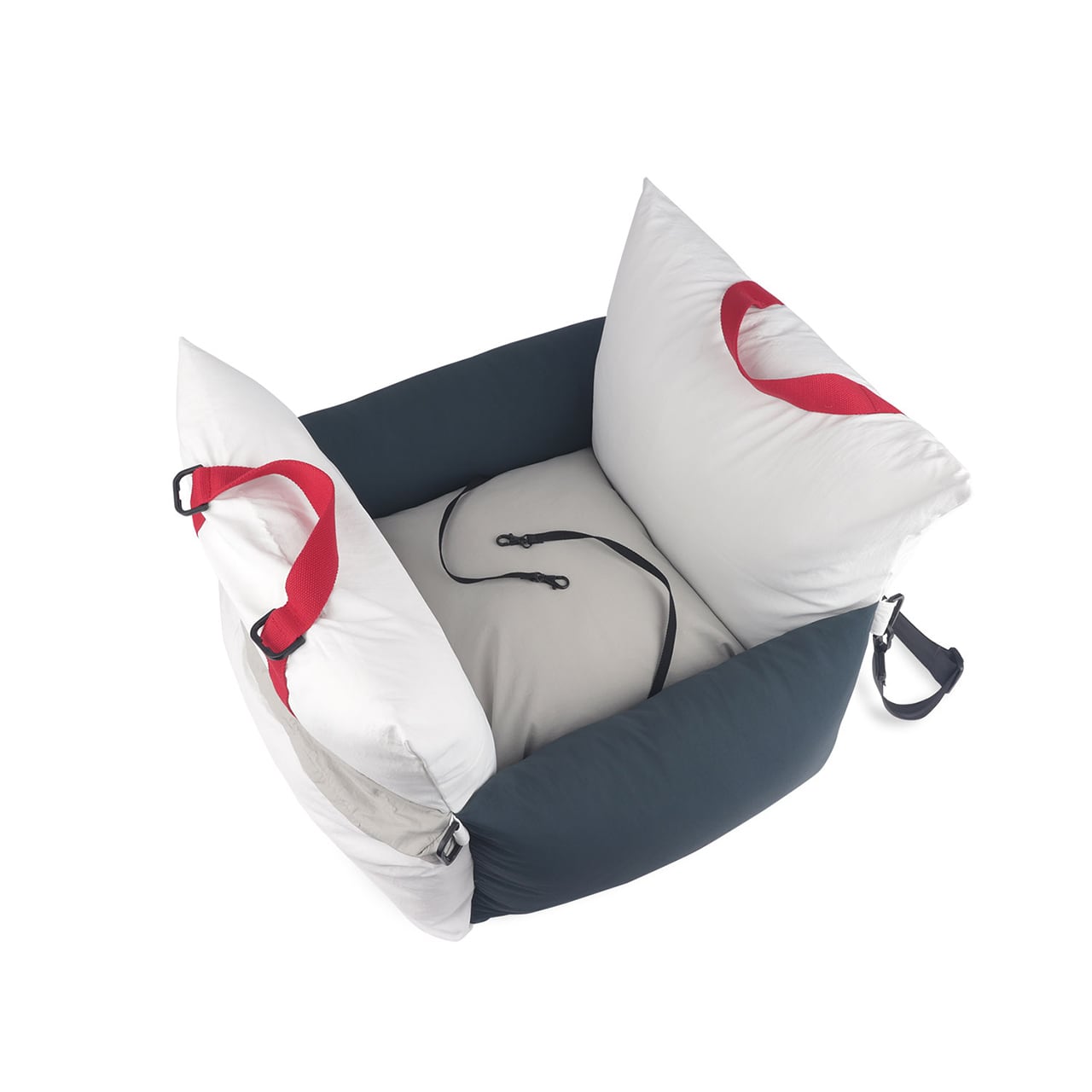 ・ベッドの背面には、座席の背もたれに固定できるようにシートベルトストラップが付いています。取り付け簡単。