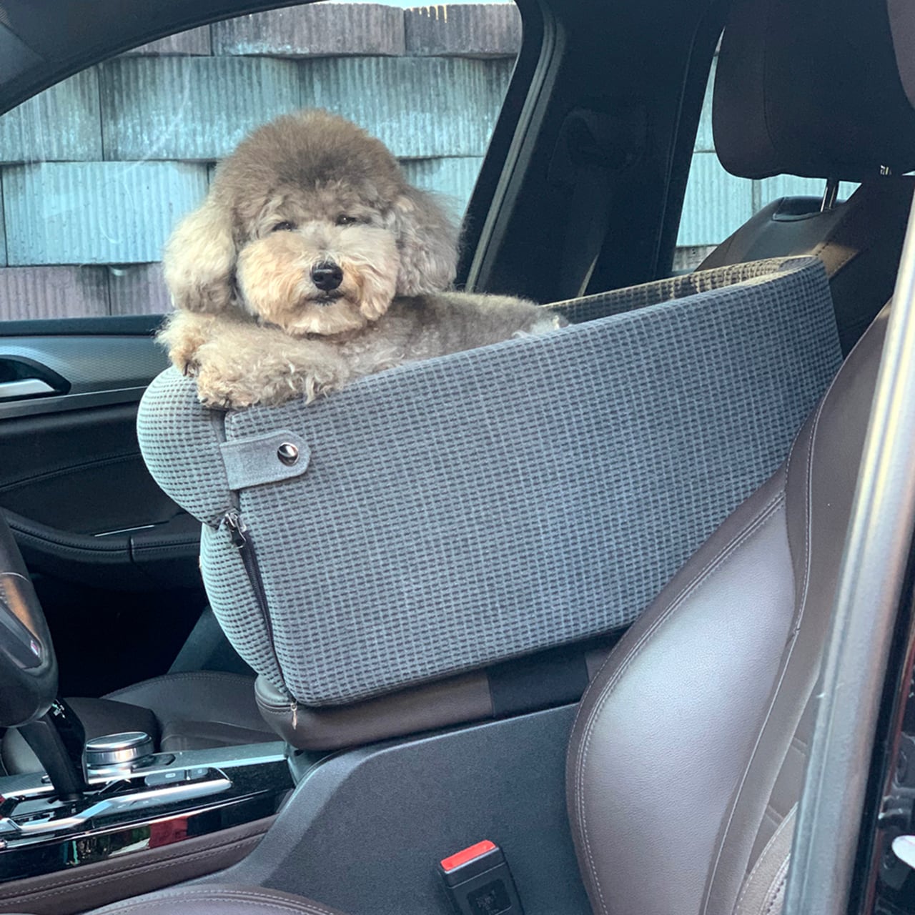 ご注意)運転席と助手席のシート間隔が18cm〜23cmの車両のタイプはSS-Slim(5kg未満のペットにおすすめ)となります。「Console Box Dog Car Seat SS-Slim」をご購入ください。