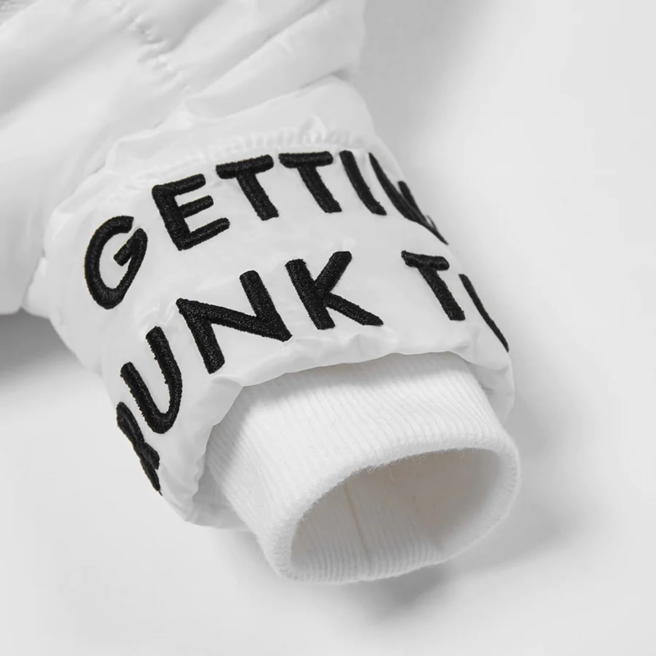 腕にジッパーと「Getting Drunk to Ski」のスローガンが付いています。