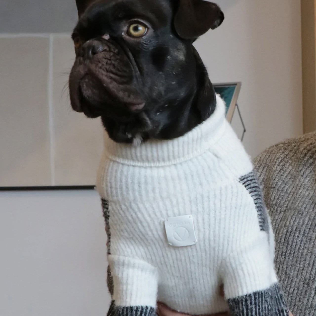 ロンドンの大注目のブランド、 OVER GLAMのホワイト、グレー、ブラックのコントラストデザインが特徴のタートルネックセーター。