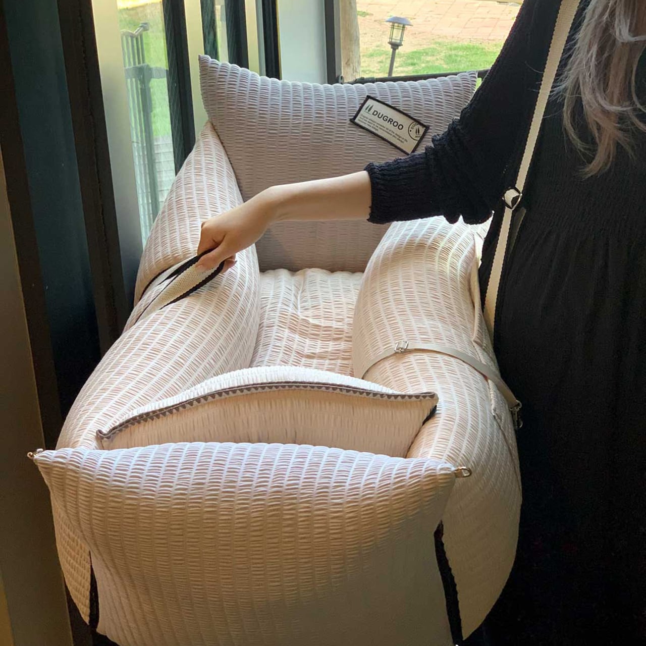 DUGROOペット用オールラウンドドライブベッドは愛犬の車酔いを少なくするために、振動を最小限に抑えるためのシート角度や重量などを考慮の上、デザイン設計されたベッドです。しっかりとした厚みや重量で助手席や後部座席にフィットします。