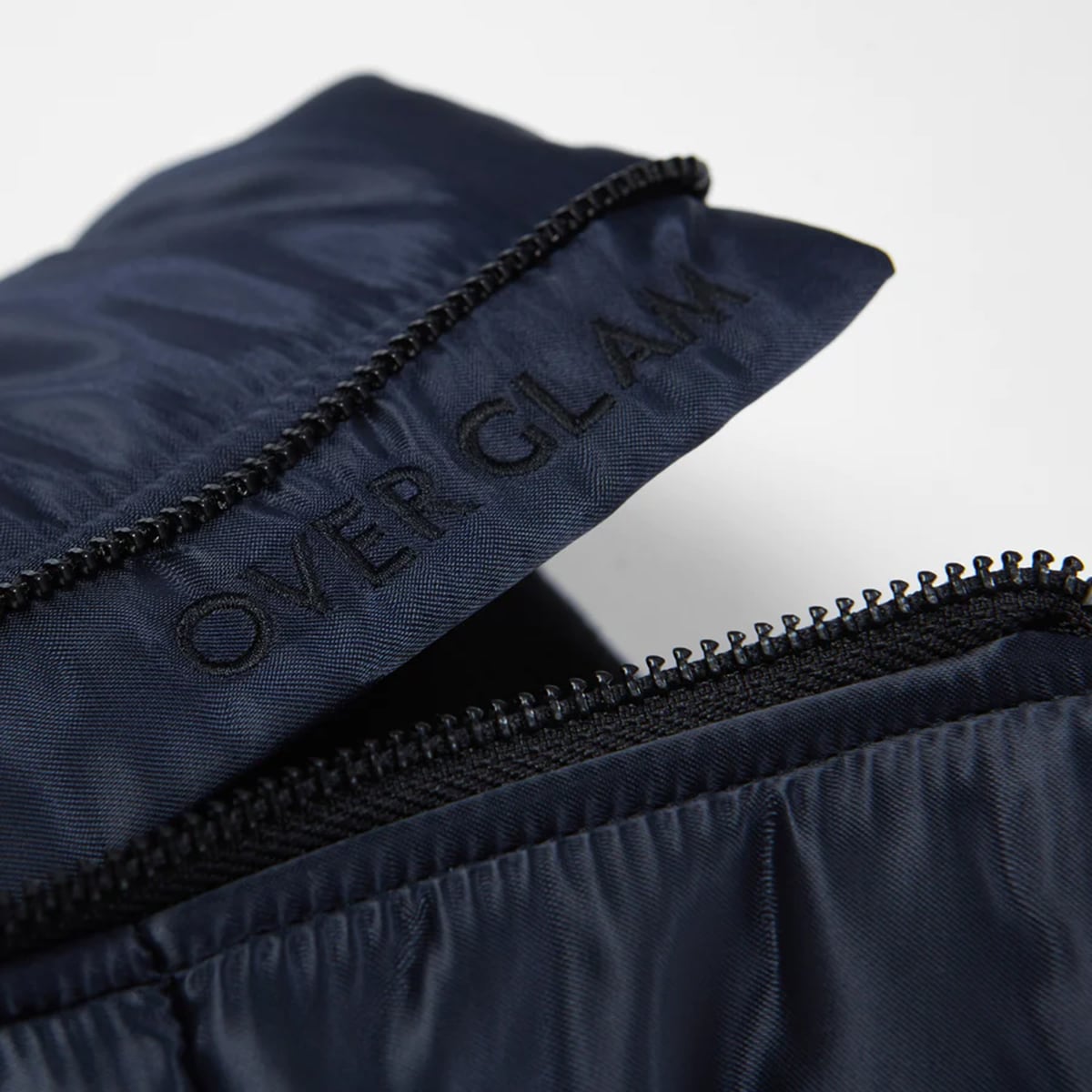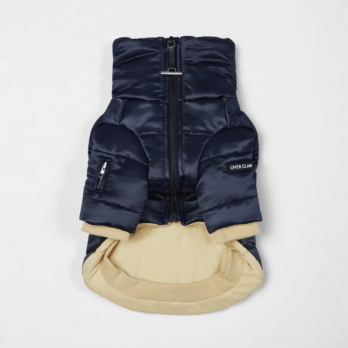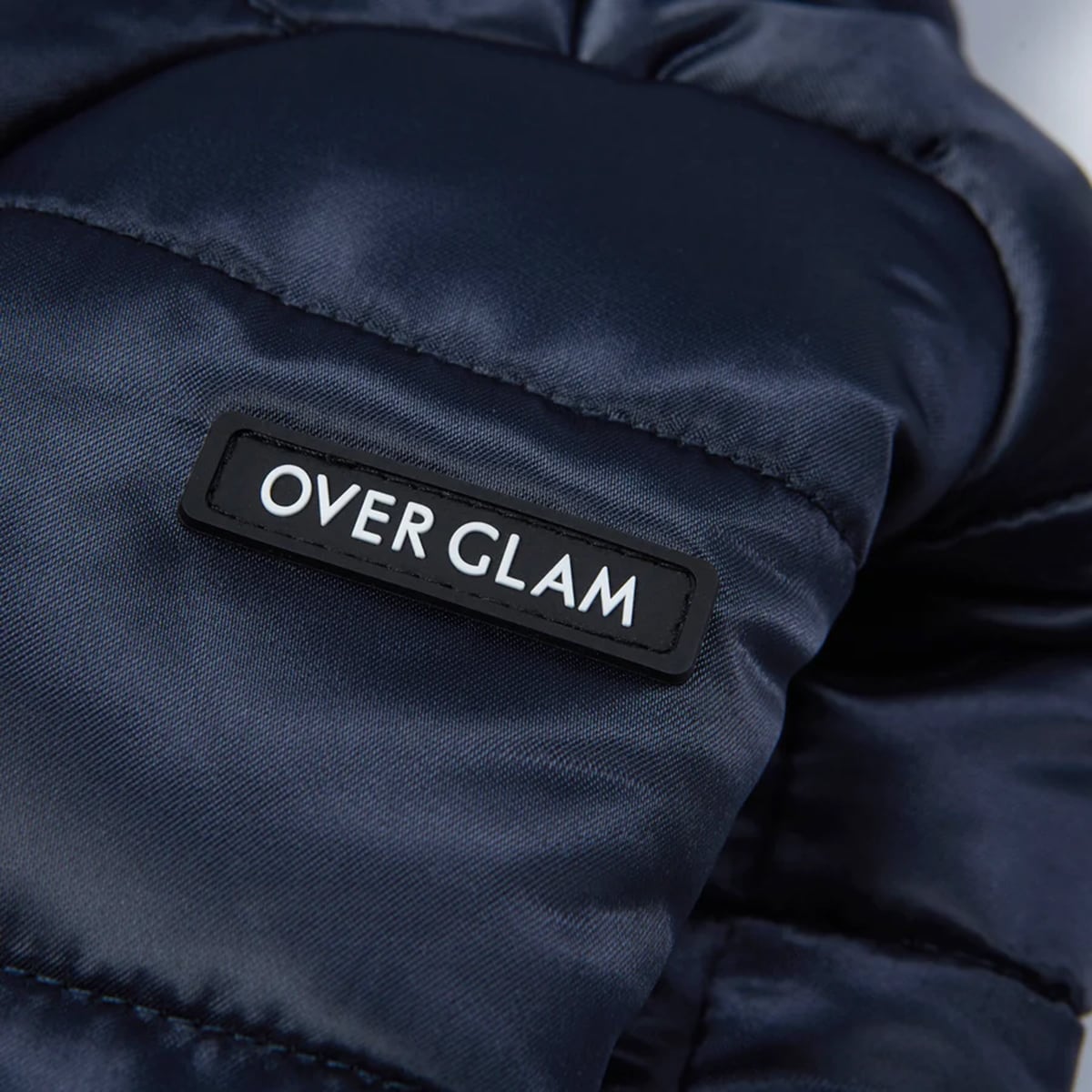 ロンドンの大注目のブランド、 OVER GLAMの腕にOVER GLAMのロゴをあしらった光沢のあるスタイルの特別なダウンジャケット。首にジッパーと「ゲッティング ドランク トゥ スキー」のスローガンが付いています。グリーン、ネイビー、シルバーからお選びいただけます。