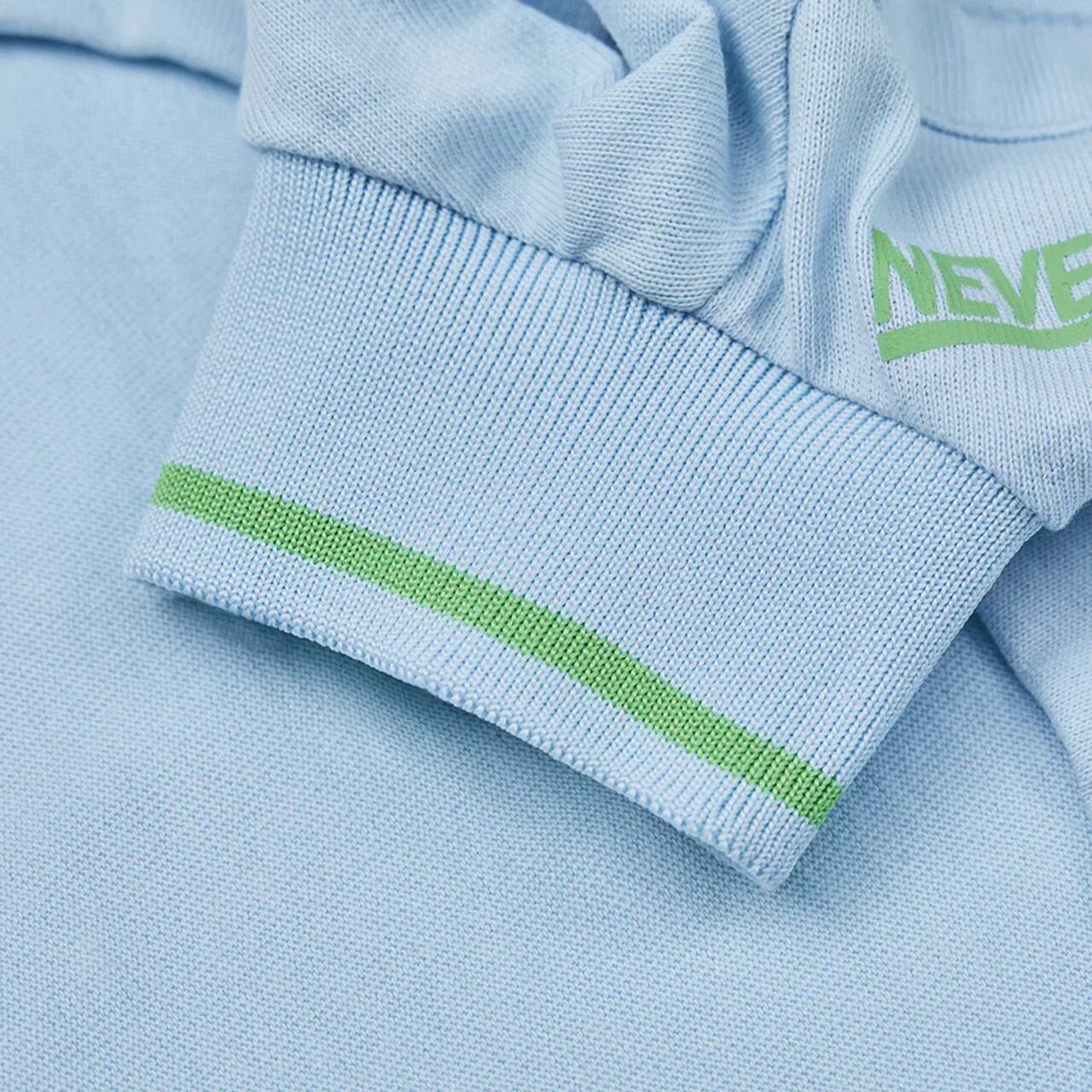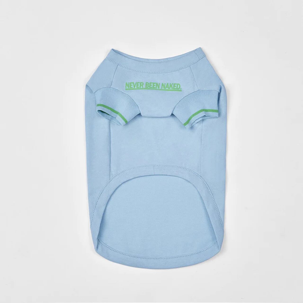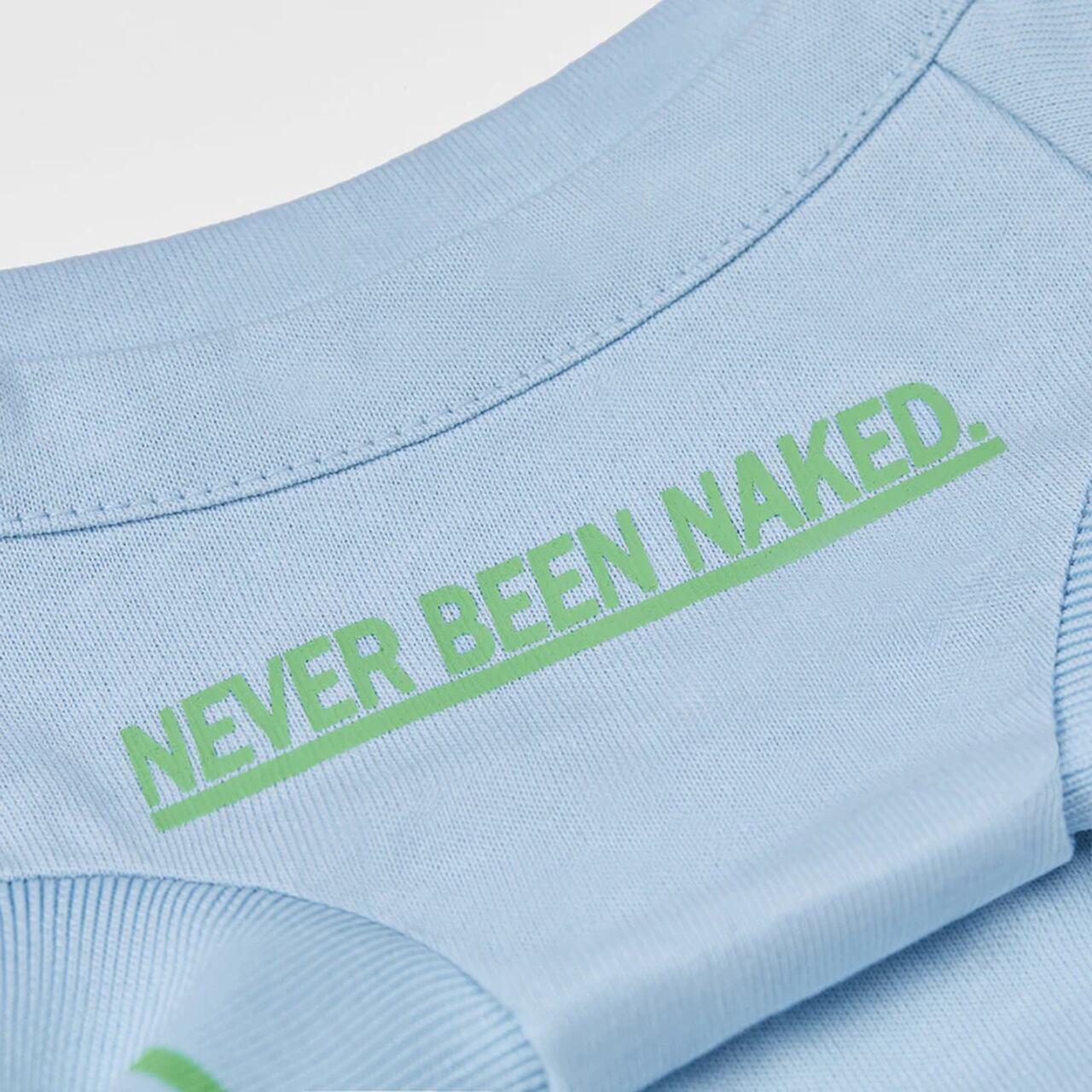 Blue:胸に「Never been Naked」のテキスト入りでテキストと袖のストライプがグリーンカラー