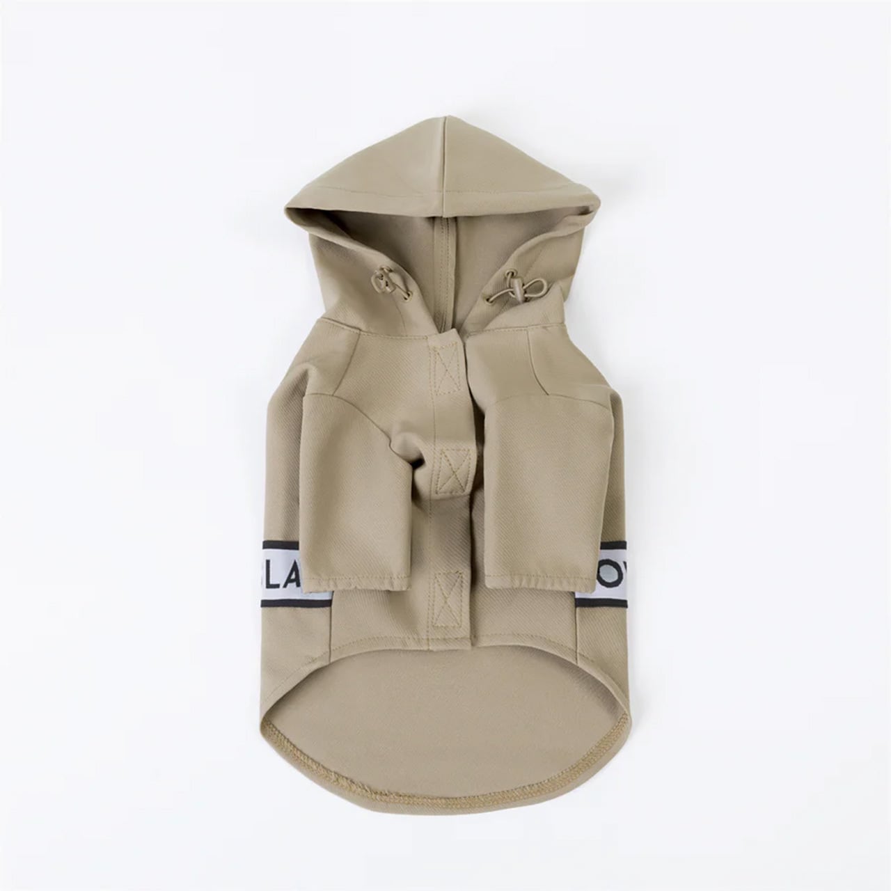 OVER GLAMのロゴが全体にデザインされたフード付きの薄めのコートです。