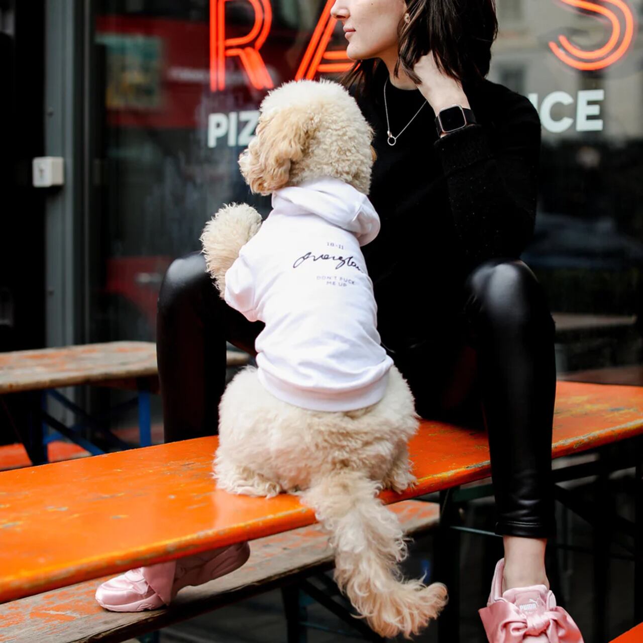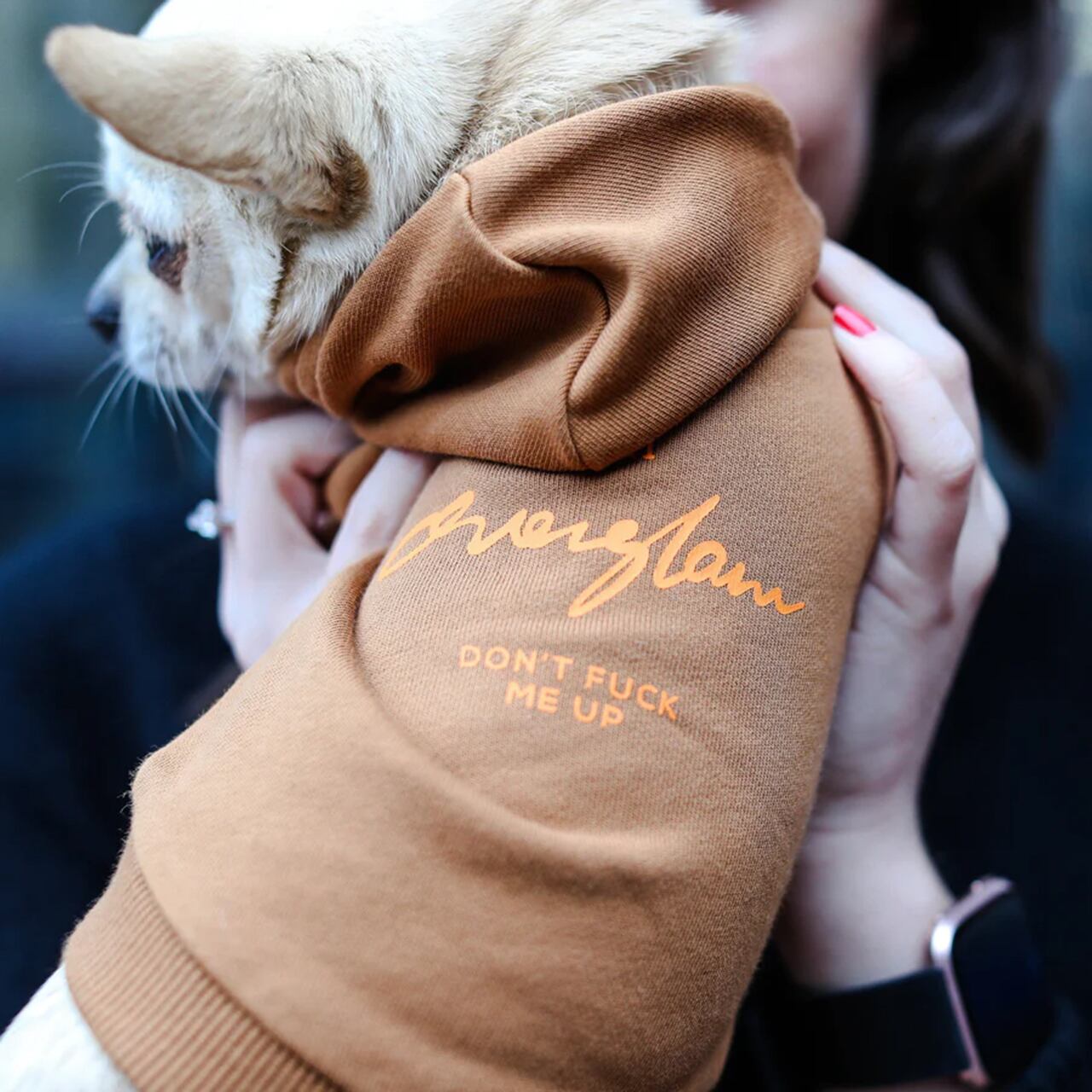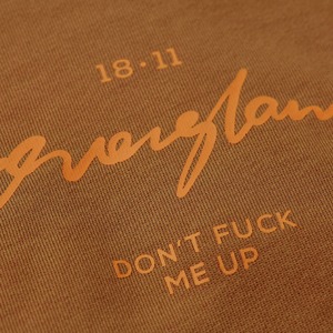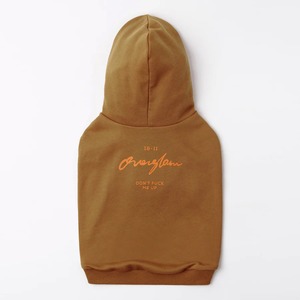 背中に「Overglam」と「Dont Fuck me up」と書かれたスリーブパーカー。胸にはOVER GLAMのロゴタグがついています。ホワイト、ブラウンからお選びいただけます。