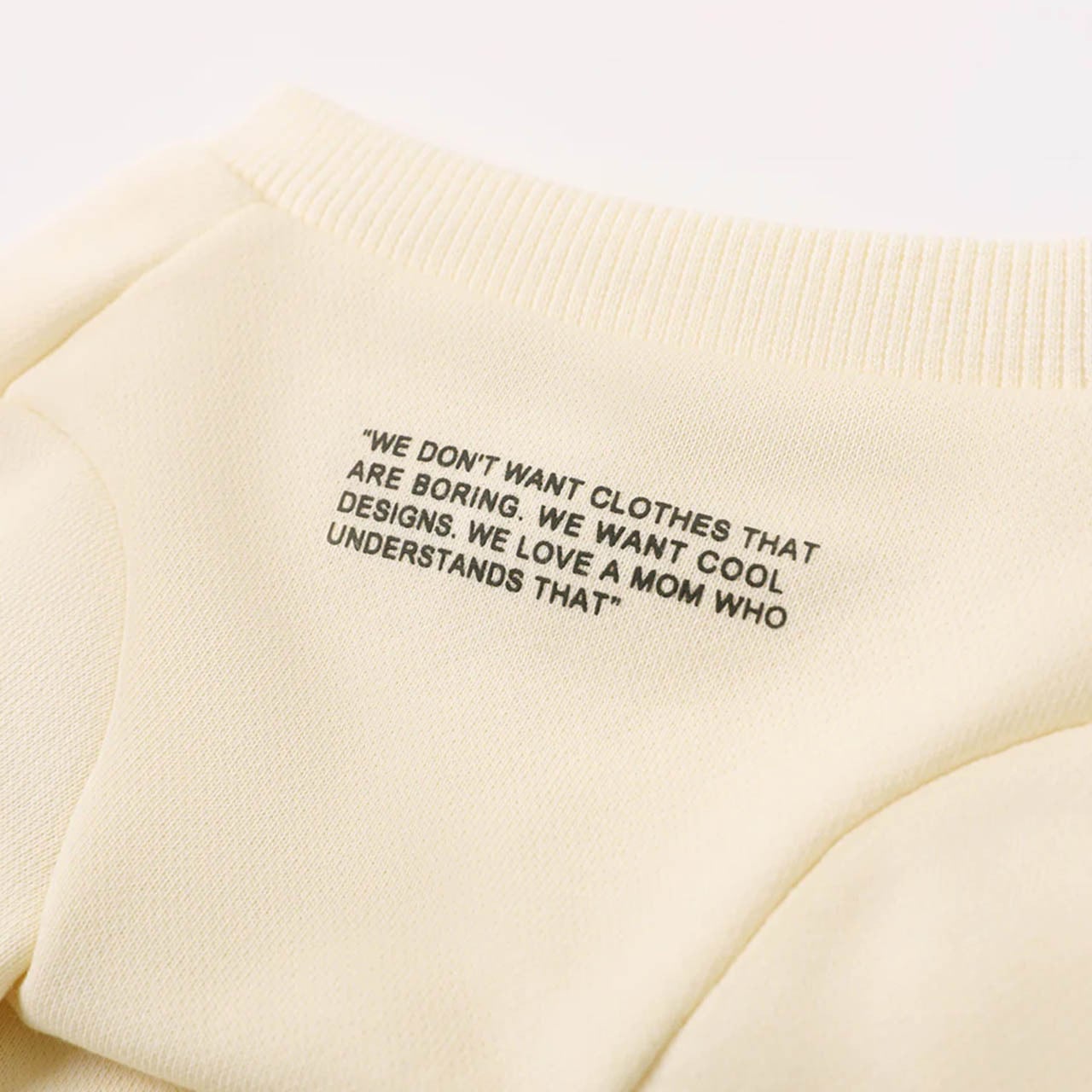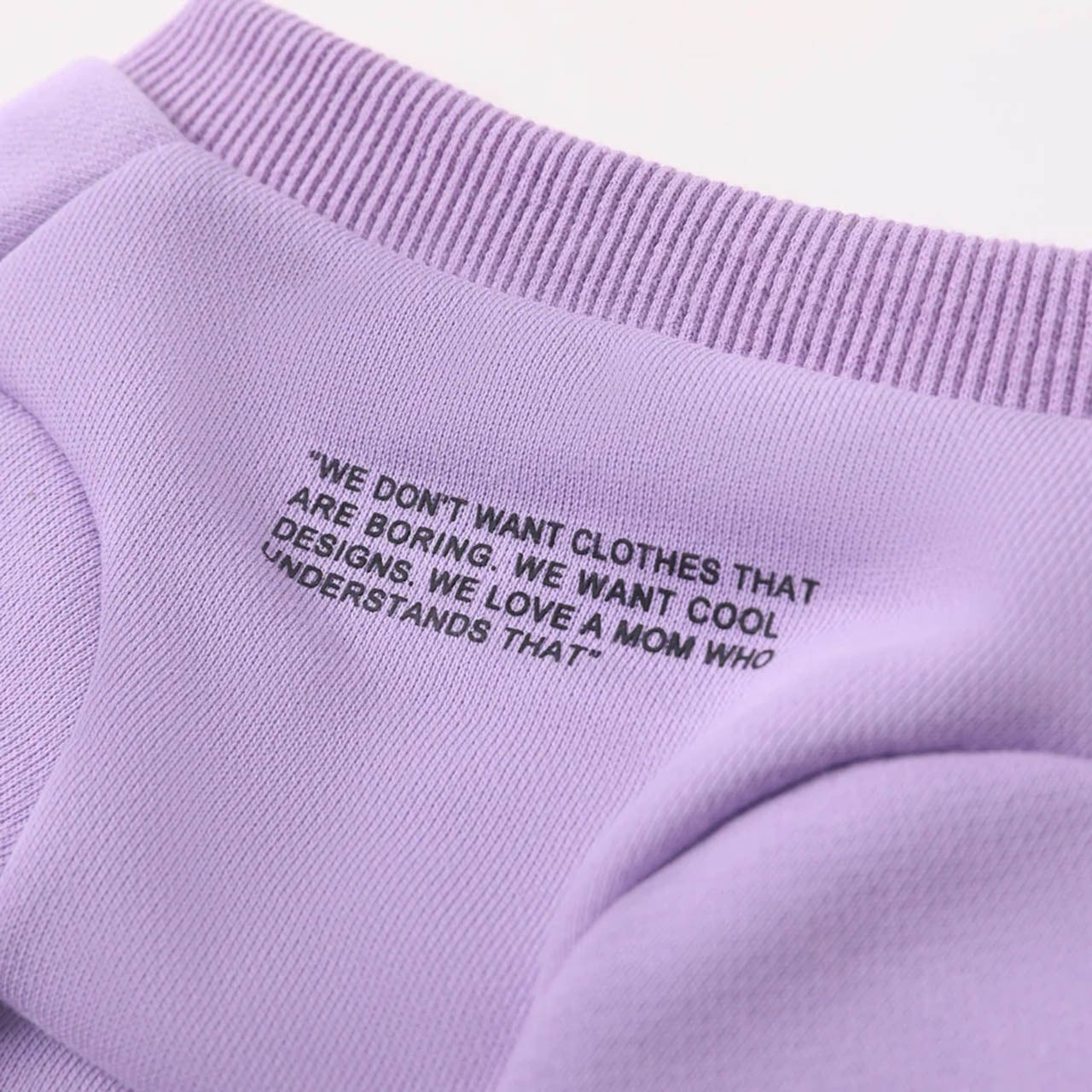 胸にスローガンが入ったスウェットシャツ。クリーム、ベビーブルー、パープル、オレンジからお選びいただけます。
