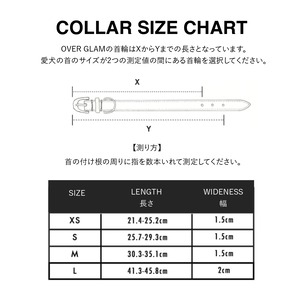 【Size】OVER GLAMの首輪はXからYまでの長さとなっています。愛犬の首のサイズが2つの測定値の間にある首輪を選択してください。写真を参考に計測してください。
